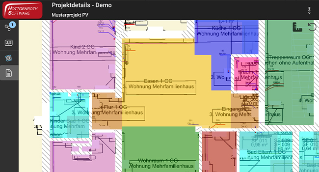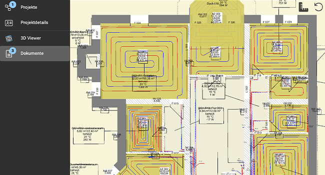 Mit dem 3D-Viewer können ausgewählte Projektdaten auf z.B. dem Tablet angezeigt und direkt vor Ort besprochen werden. Egal ob Adress- oder Kontaktdaten, 3D- oder tabellarische Projektdarstellungen: HottConnect gewährt eine komplette Übersicht. Das 3D-Gebäudemodell inkl. zugehöriger Pläne bildet eine anschauliche Darstellung des Projektes ab. Etagen, Räume und Bauteile sowie deren Eigenschaften können schnell eingesehen, gezeichnete Rohrnetze übersichtlich dargestellt und Planungsunterlagen eingesehen werden. Es ist möglich, Bauteile ein- und auszublenden, zu zoomen, drehen, filtern oder zu selektieren. Mittels der Bauteilgalerie können Bilder und Notizen in den generierten Plänen zu Elementen des Projektes abgelegt werden. So hat der Nutzer stets alle relevanten Informationen zur Hand. Projekte können per Mail versendet und Projektdaten als PDF exportiert, oder neue Pläne importiert werden.