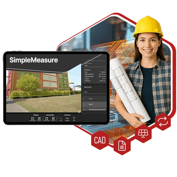 Handwerker, Dienstleister, Energieberater oder Planer: SimpleMeasure ist die Lösung für ein schnelles Gebäudeaufmaß. Wann immer Flächen, Fenster, Erker oder schwer zugängliche Bereiche wie Dachflächen vermessen werden sollen, übernimmt die App die Dokumentation vor Ort. Die weitere Bearbeitung und Planung kann im Anschluss mit der Desktop-Version im Büro erfolgen. Selbst wenn das Vermessen vor Ort nicht möglich ist, kann der Prozess per importiertes Foto erfolgen.