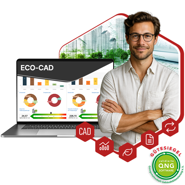 ECO-CAD ermöglicht eine transparente für eine nachhaltige Gebäudeplanung, Zertifizierung nach QNG und Fördermittelbeantragung nach KFN/KNN - effizient, transparent und zukunftssicher.